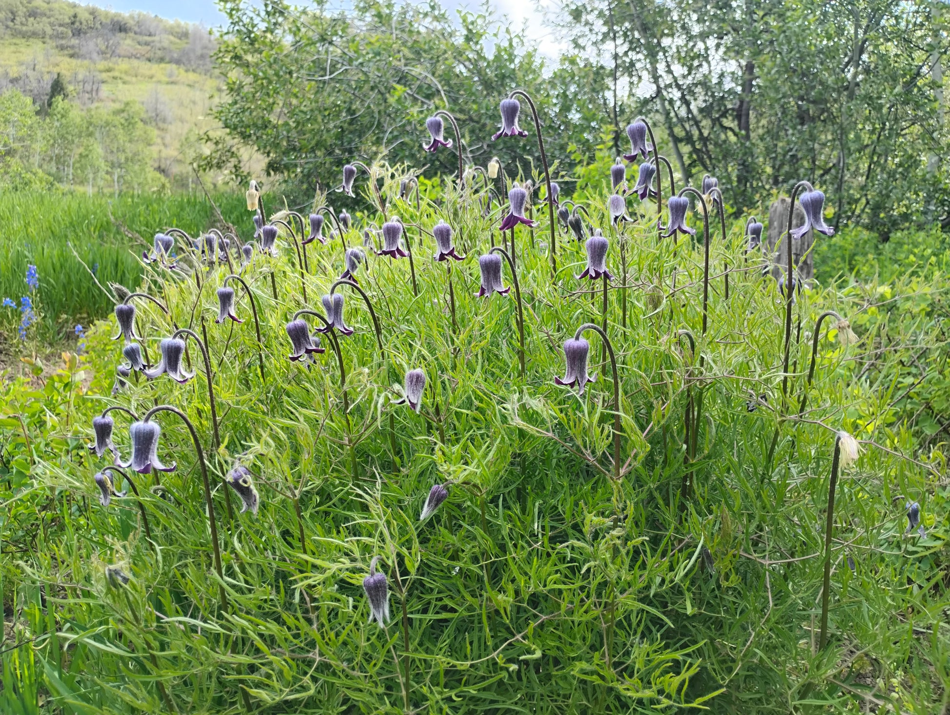 Hairy Clematis aka Sugarbowls are a unique and whimsical wildflower of The West. The large, bell-shaped flowers are formed with a single flower per stem, which in favorable conditions, each plant can produce well over a couple dozen stems.